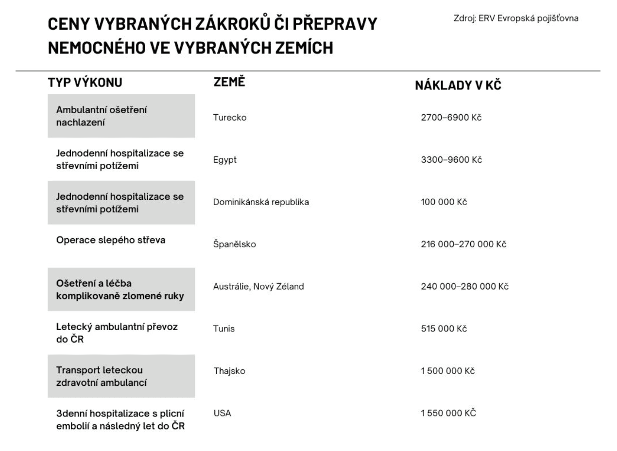 Další věcí, na kterou je dobré dát si pozor, jsou sporty. Spousta z těch, kterým se Češi věnují, patří z pohledu pojišťovny mezi rizikové. Tedy takové, u kterých hrozí vyšší riziko zranění a musí se připojistit, pokud je na dovolené plánujete dělat. Patří mezi ně třeba jachting, ferraty s náročností C a D nebo potápění s přístrojem. Pro představu přikládám tabulku s orientačními cenami za různé lékařské výkony ve vybraných zemích.